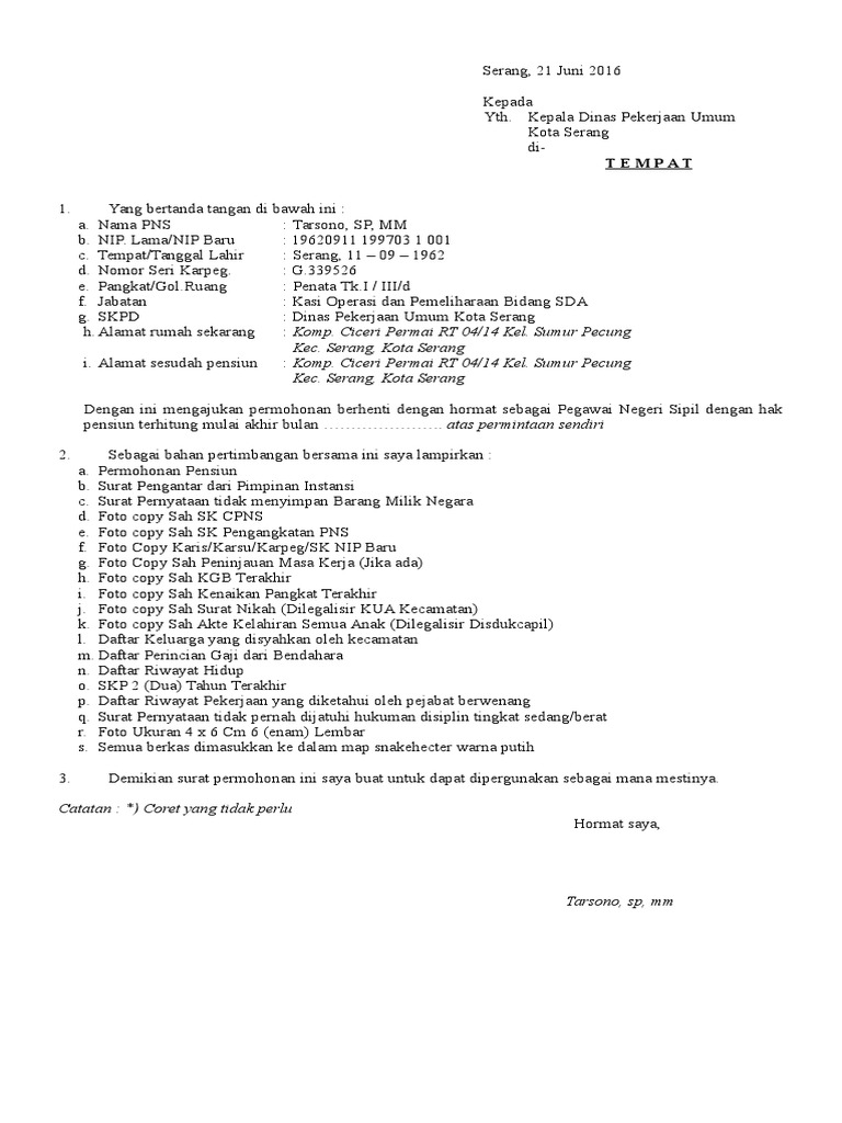 Dan harapannya, ia bisa tetap bekerja sampai jangka waktu yang lama bahkan hingga pensiun. Saat kita mengajukan pengajuan pinjaman. Contoh surat pengunduran diri anggota polisi dan tni. Contoh surat pensiun dini dari perusahaan. Dengan h#rmat, yang yang bertandangan di ba$ah ini % &ama.